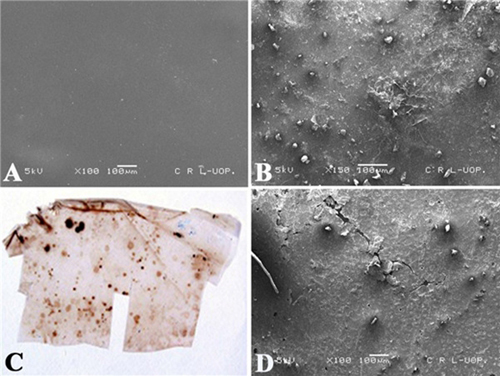 圖中表明的是埋藏在土壤層中四個(gè)月的聚氨酯材料膜的掃描儀透射電鏡相片(A)對比PU膜的SEM,(B)埋在土壤層里一個(gè)月的PU膜的SEM,(C)埋在土壤層里四個(gè)月的PU膜,(D)埋在土壤層里四個(gè)月的聚氨酯材料膜的SEM。