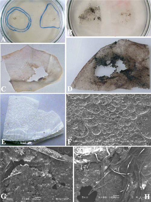 圖中能夠 表明聚氨基甲酸酯(PU)表層生長發(fā)育的塔賓曲霉菌的轉(zhuǎn)變,(A)用塔賓曲霉菌打疫苗并以PU無菌檢測膜遮蓋的SDA板,(B)在孵育四天后PU膜遷移到MSM瓊脂板,及其(C)三周后從MSM瓊脂平板電腦上收購 的PU膜,(D)在SDA平板電腦上溫育兩個(gè)星期的降解掉的PU膜,(E)對降解的PU膜D的操縱,(F)對比E的SEM,(G和H)檢測D的SEM。