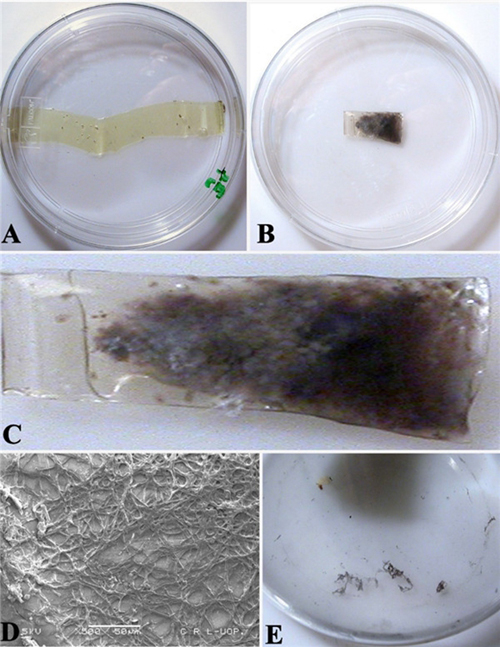 圖中則展現(xiàn)了在液體MSM中孵育了三周的PU表層上的塔賓曲霉菌。(A)殺菌PU膜,(B&C)PU膜在具備2%葡萄糖水的液體MSM中孵育二十一天后,(D)在PU膜表層上生長發(fā)育的塔賓曲霉菌,及其(E)兩月后在MSM物質(zhì)里融解的PU膜。