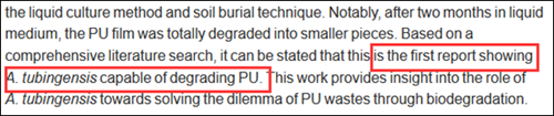 文章簡介中尤其標(biāo)明了課題組“初次發(fā)覺 塔賓曲霉菌對PU有降解功效 ”