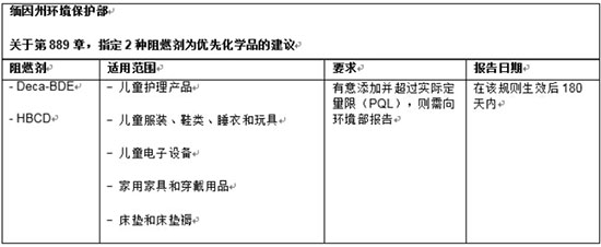 2016年10月,緬因州環境管理(DEP)建議一項新標準,擬訂十溴聯苯醚(decaBDE)和六溴環十二烷(HBCD)二種化學物質為優先選擇化學品,需考慮相對的報告規定。該提議建立了一個全新升級的第889章。假如有心加上并超出定量限(PQL)的這種化學品,則必須報告。報告的起效日期將在該標準起效之日起180天內。
