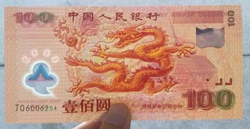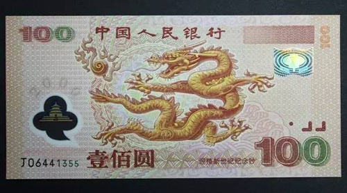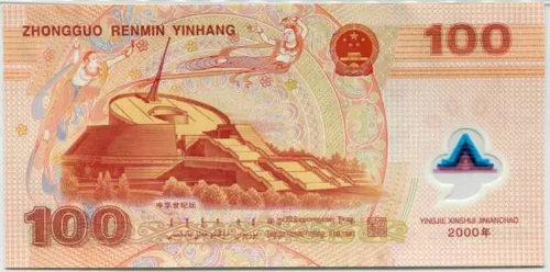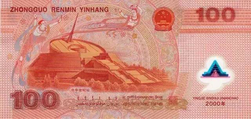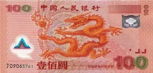 中央人民銀行2000年發行的“迎來新時代”一百元塑料紀念鈔