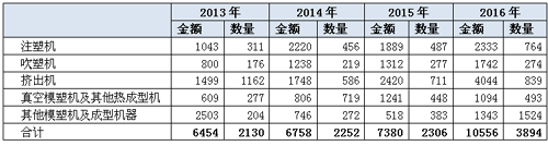 表1 2013-2016年中國塑機出口印度分商品統計分析
