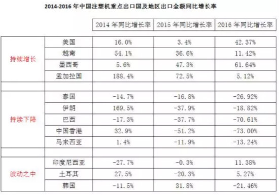 對墨西哥的出口額度持續三年不斷下降,下降率不斷擴大,2016年降幅達到70.61%,躋身中國注塑機十大出口國之列。