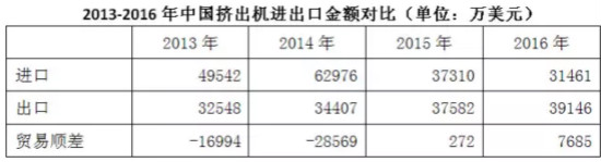 自2015年起中國擠出機進出口完成順差,2016年順差值擴張至7685萬美元。