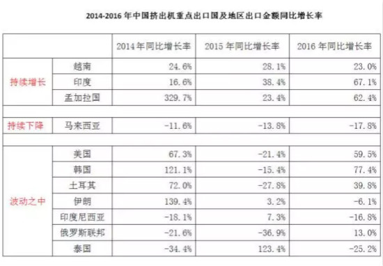 越南地區、印尼、孟加拉持續三年維持不斷髙速增長,英國、日本、土爾其2016年出現大幅增長,出口該三國的額度大大的高過2014年。