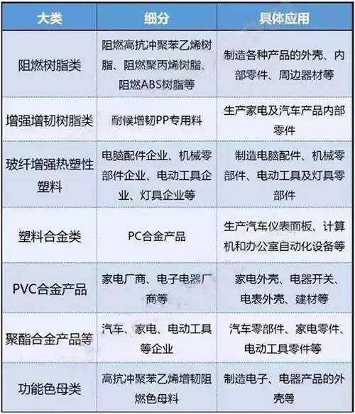 改性塑料商品關鍵類型有阻燃性環氧樹脂、提高改性環氧樹脂類、塑料鋁合金類、作用色母類等。