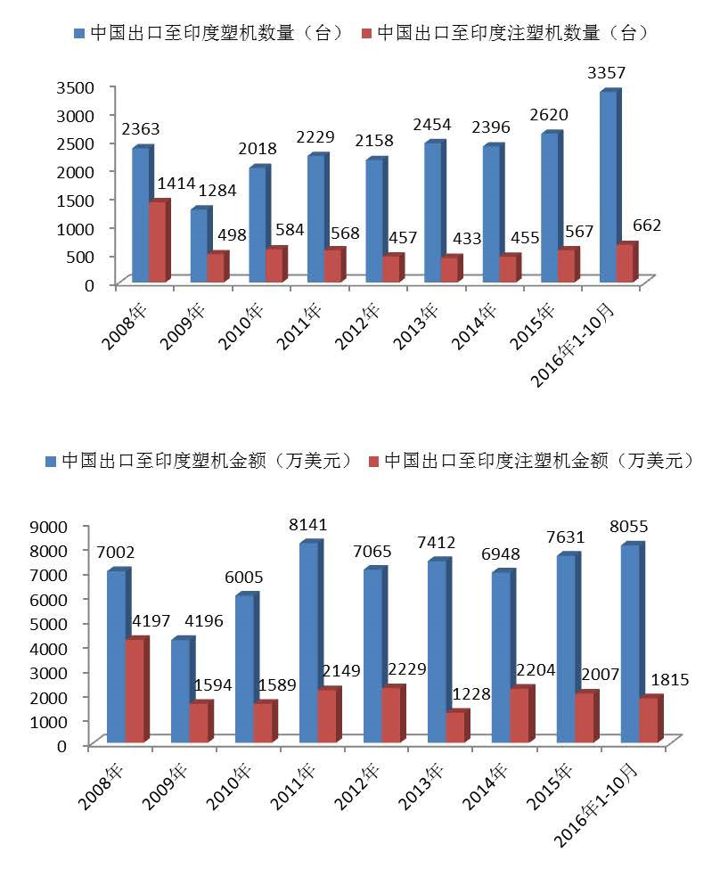 印度是中國塑料機械關鍵的出口銷售市場,雖然自2009年印度對華貿易塑料機征繳巨額反傾銷至今,中國對印度的塑料機出口顯著降低,但從領域整體看來,中國對印度的塑料機械出口總產量基礎維持穩定,實際出口總數、額度如下圖所示。