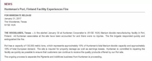 實際上,波里市現有13萬噸級二氧化鈦產能,等同于15%Huntsman的總產能和10%歐州總需要量。其起火地址早已遮蓋經濟損失商業保險。Huntsman已經下手盡早恢復設備,以保證顧客能一切正常進貨。