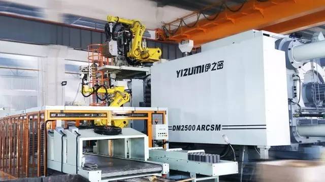 另外,為了更好地進(jìn)一步提高缸體生產(chǎn)的安全性和可靠性,浙江臥加仍在2500T壓鑄機(jī)上配套設(shè)施了伊之密智能機(jī)器人系統(tǒng)集成,除去人力實際操作,完成自動式生產(chǎn)。