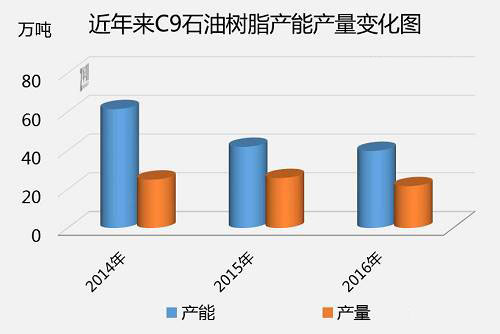 C9石油樹脂產能關鍵遍布在山東省、河南省、東北地區,約占全國各地產能的72%上下。之上地域歸屬于環保督查的重污染區域,加上處在北京首都附近,且歸屬于霧霾天氣比較嚴重地區,因而環境保護查驗也分外嚴苛。據中宇資訊數據分析,2016年C9石油樹脂產能約為40萬噸級,較2014年降低了35%。產能降低符合我國取代落伍產能及其供給側結構的方針政策。近些年國際性石油價格底位運作,中下游行業要求低迷,C9石油樹脂行業生產制造主動性不高,設備閑置不用率提升,故一部分公司賣出機器設備調產其他行業,它是供貨產能過剩,要求不夠的必然趨勢。