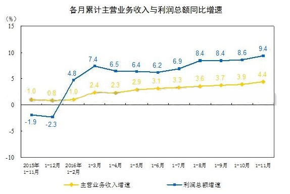 據(jù)中國統(tǒng)計(jì)局全新統(tǒng)計(jì)分析顯示信息,2016年1-11月份,我國規(guī)模以上企業(yè)工業(yè)企業(yè)主營業(yè)務(wù)收益為103.1萬億元(下列均為rmb),同比增長4.4%;完成利潤總金額60334.一億元,同比增長9.4%,增速比1-10月份加速0.八個(gè)點(diǎn)。產(chǎn)生主營業(yè)務(wù)成本費(fèi)88.4萬億元,同比增長4.2%;主營業(yè)務(wù)收益利潤率是5.85%。