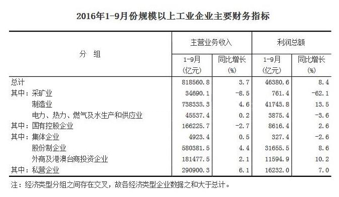 已有人閱讀此文 - -據中國統計局全新統計分析顯示信息,2016年1-9月份,我國規模以上工業企業完成主營業務收益81.9萬億(下列均為rmb),同比增長3.7%;完成資產總額46380.六億元,同比增長8.4%,增長速度與1-8月份差不多。產生主營業務成本費70.3萬億元,同比增長3.5%;主營業務收入利潤率為5.67%。