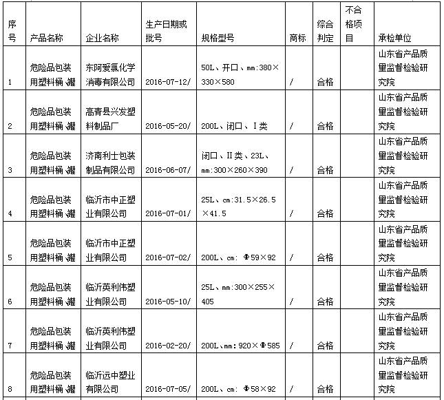 2016年第三一季度,山東質監局機構進行了危險品包裝用塑料桶、罐產品品質省監管抽查。此次共抽查了我省18家公司生產制造的20批號危險品包裝用塑料桶、罐商品,均合乎有關規范的要求。
