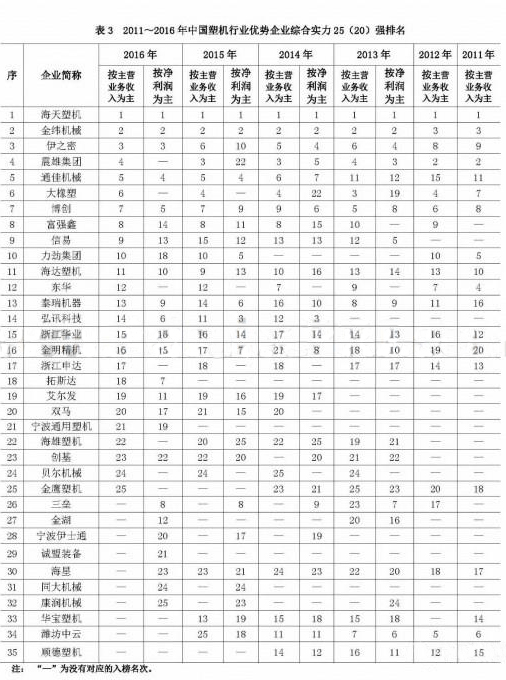 自2011年至今,中國(guó)塑料機(jī)械設(shè)備行業(yè)協(xié)會(huì)已持續(xù)六年朝向各界人士發(fā)布了“中國(guó)塑機(jī)加工制造業(yè)整體實(shí)力25強(qiáng)企業(yè)”、“中國(guó)塑料注入成形機(jī)行業(yè)15強(qiáng)企業(yè)”、“中國(guó)塑料擠壓成形機(jī)行業(yè)10強(qiáng)企業(yè)”、“中國(guó)塑料中空成型機(jī)行業(yè)3強(qiáng)企業(yè)”和“中國(guó)塑機(jī)鍋爐輔機(jī)及配套設(shè)施件行業(yè)5強(qiáng)企業(yè)”。