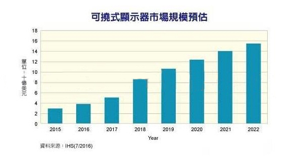 市場調研組織IHS全新預計,到2022年時,可撓式顯示器的年產值經營規模將上看155億美金,與2016年的37億美金對比,發展力度達到300%。在其中,配戴式設備與行動設備為推動可撓式顯示器要求發展的幾大模塊。