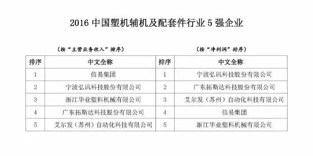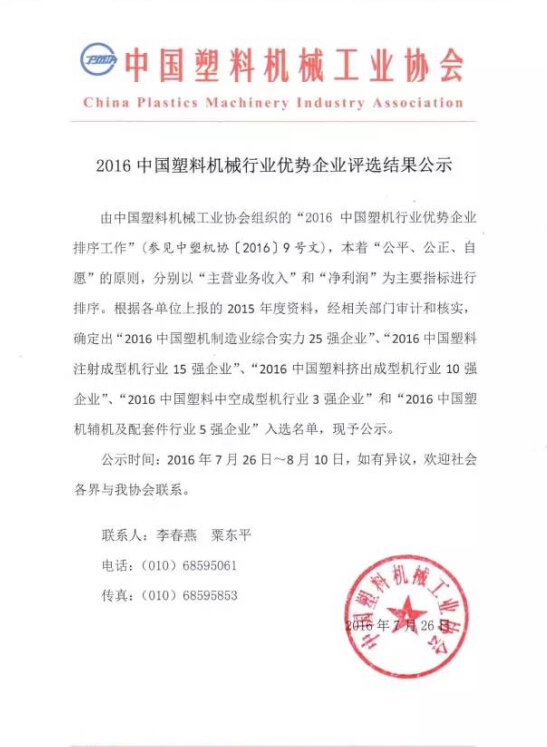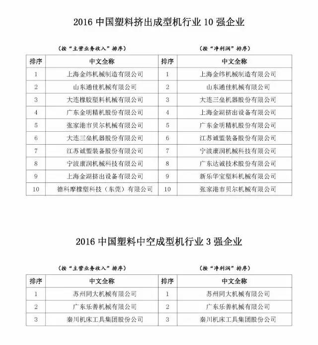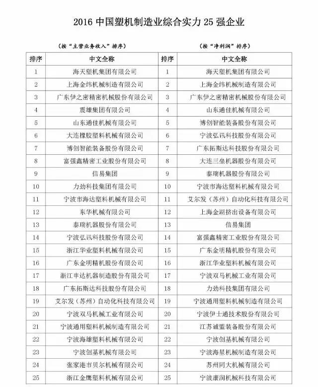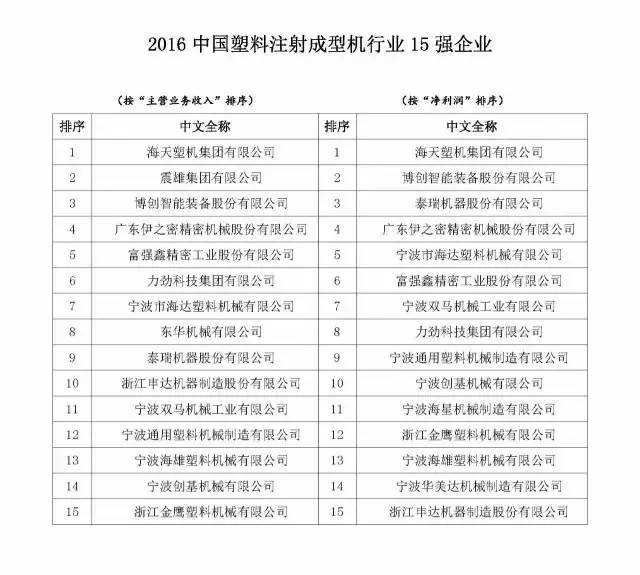 已有人閱讀此文 - -由中國塑料機械設備行業協會機構的“2016中國塑機行業優點公司排序工作中”(參照中國塑機協【2016】9號本),秉著“公正、公平、同意”的標準,各自以“主要經營的業務收益”和“純利潤”為指標值開展排序。依據各企業匯報的2015年度材料,經有關部門財務審計和核查,明確出“2016中國塑機加工制造業整體實力25強公司”、“2016中國塑料注入成形機行業15強公司”、“2016中國塑料擠壓成形行業10強公司”、“2016中國塑料空心成形行業3強公司”和“2016中國塑機鍋爐輔機及配套設施件行業5強公司”當選名冊。