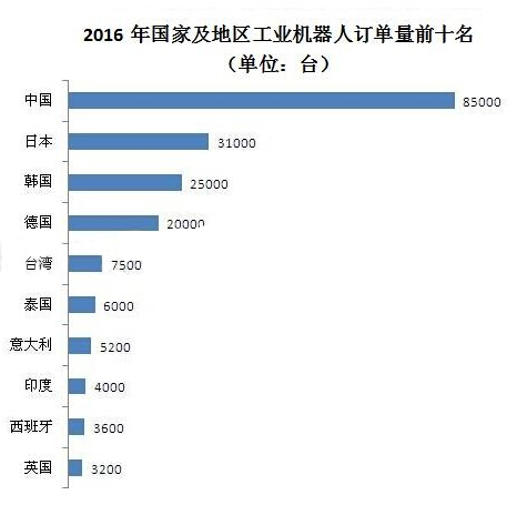 2016年工業機器人訂單信息量前十個國家及地域分別是中國、日本、日本、德國、中國臺灣、泰國、西班牙、印尼、意大利和美國。在其中,中國以8.五萬臺穩居全世界工業機器人訂單信息量的第一位。