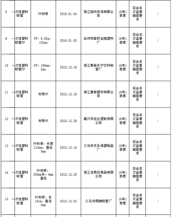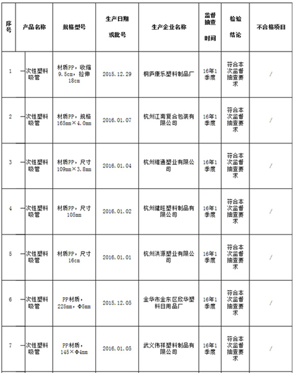 二零一六年一次性塑料吸管產(chǎn)品監(jiān)督抽查結(jié)果匯總表
