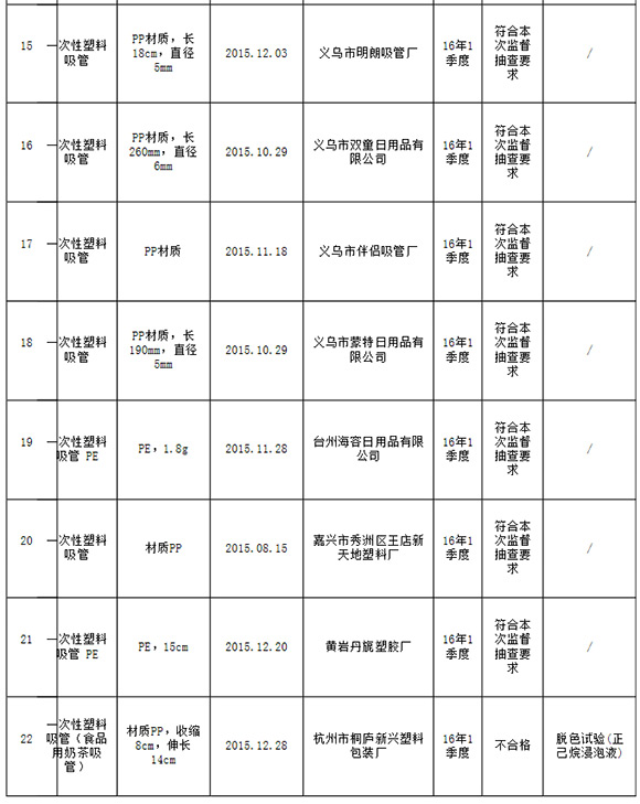 從此次發(fā)布的《2016年一次性塑料吸管產(chǎn)品監(jiān)督抽查結(jié)果匯總表》中發(fā)覺,杭州桐廬縣新起塑料包裝廠生產(chǎn)制造的1批號一次性塑料吸管(食品類用奶茶店吸管)被驗出褪色實驗(正己烷浸泡液)新項目不過關(guān)。