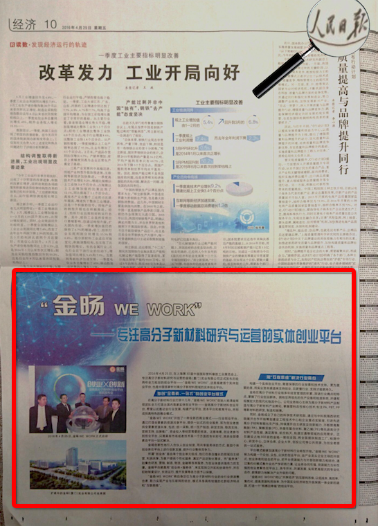 接著沒多久,《人民日報》[經濟發展版]公布了《”金?D WE WORK”--- 專注高分子新材料研究與運營的實體創業平臺》一文,深層次分析了金?D高分子材料新型材料創業平臺。