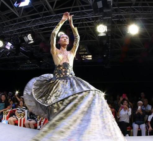 展覽廳內的衣服架上擺著各式各樣的衣服褲子、牛仔褲子及其挎包、鞋……這種商品的布料是再造的紡織材料,原材料由塑料產品做成。從5600個環境保護垃圾回收站中收購 純凈水塑料瓶,隨后破碎成殘片,做成再造聚脂粒,由再造聚脂粒再刮絲織布機,最終制做成環境保護再造紡織品。