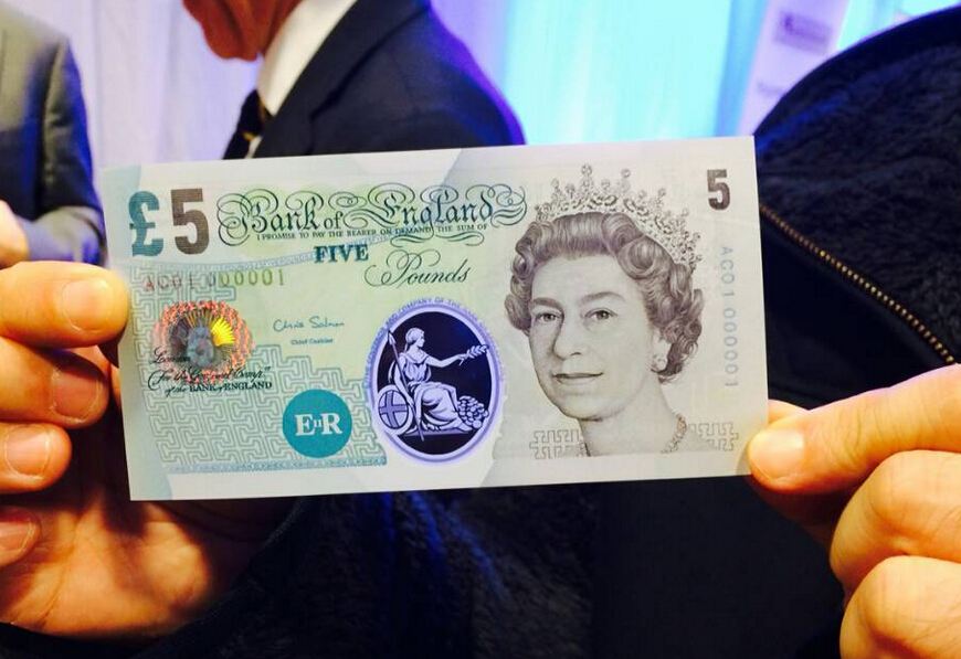新版本5英鎊塑料鈔票上印著坐落于蘇格蘭首府英國愛丁堡周邊的福斯鐵路橋,以留念該橋完工125周年紀念。克萊茲代爾金融機構表明,新鈔比現階段應用的5英鎊鈔票略微小一點,但依然能在atm機上應用。