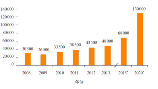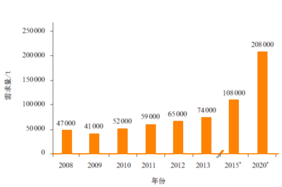圖2 2008-2020 年全世界CF 的銷售市場需求量及將來預測