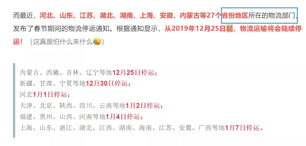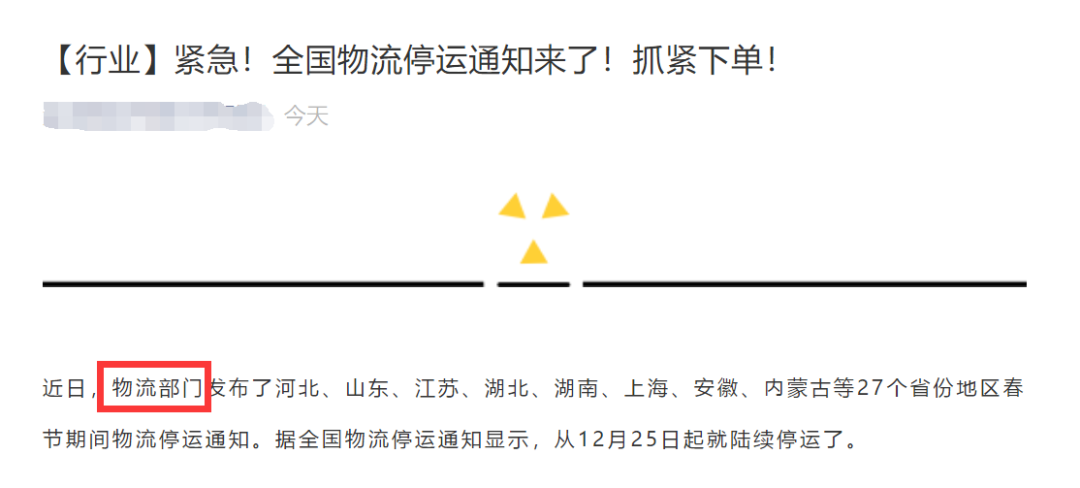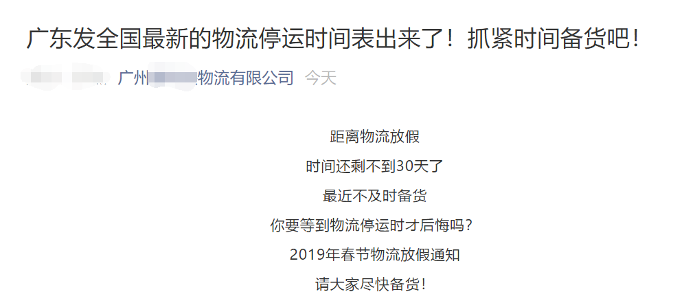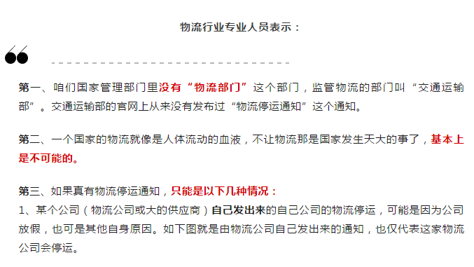 內(nèi)容是:物流部門發(fā)出通知,某省某省等幾個(gè)省從幾號(hào)到幾號(hào)物流停運(yùn),請(qǐng)企業(yè)抓緊備貨,否則到時(shí)候你買的到貨,貨也運(yùn)不過去之類的話。