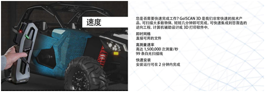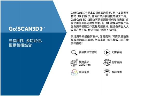 Go!SCAN3D™是搜料網聯合中科院廣州電子所共同發售的快速、用戶友好型手持式3D掃描儀。作為產品開發階段的強大工具,Go!SCAN 3D掃描儀可快速測量任何復雜表面,首次使用即可得到理想結果。與3D建模軟件和產品生命周期管理工作流程無縫集成,該設備將會大大改善產品開發、促進創新、縮短上市時間。