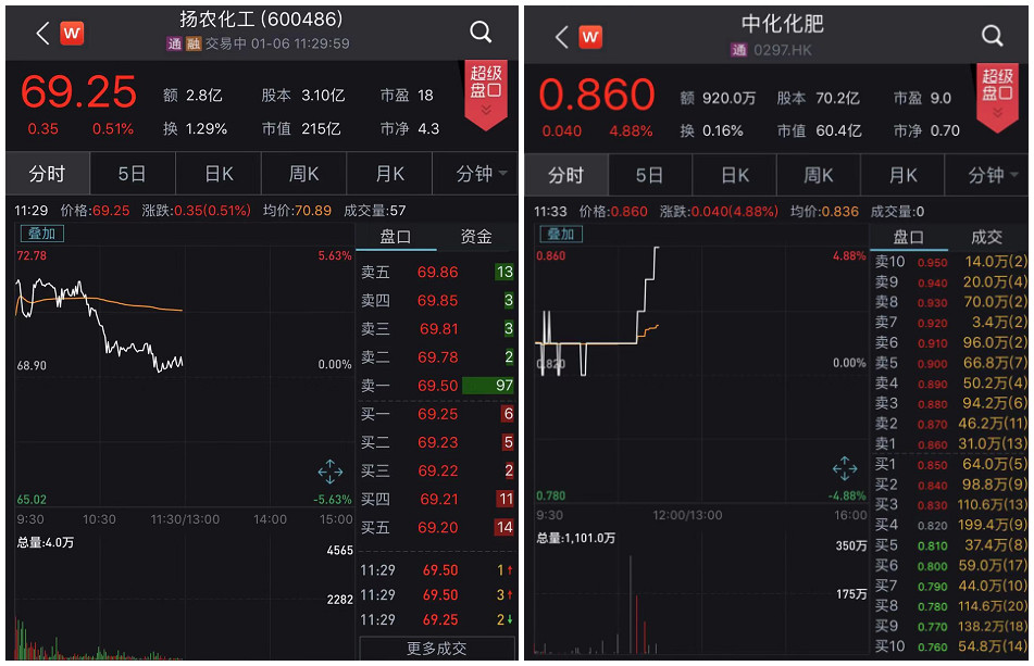 1月6日上午,此次合并涉及的4家上市公司——中化集團旗下的中化化肥(00297.HK)、揚農化工(600486.SH)、荃銀高科(300087.SZ)和中國化工旗下的安道麥A(000553.SZ)紛紛上漲,其中荃銀高科封住“一”字板。