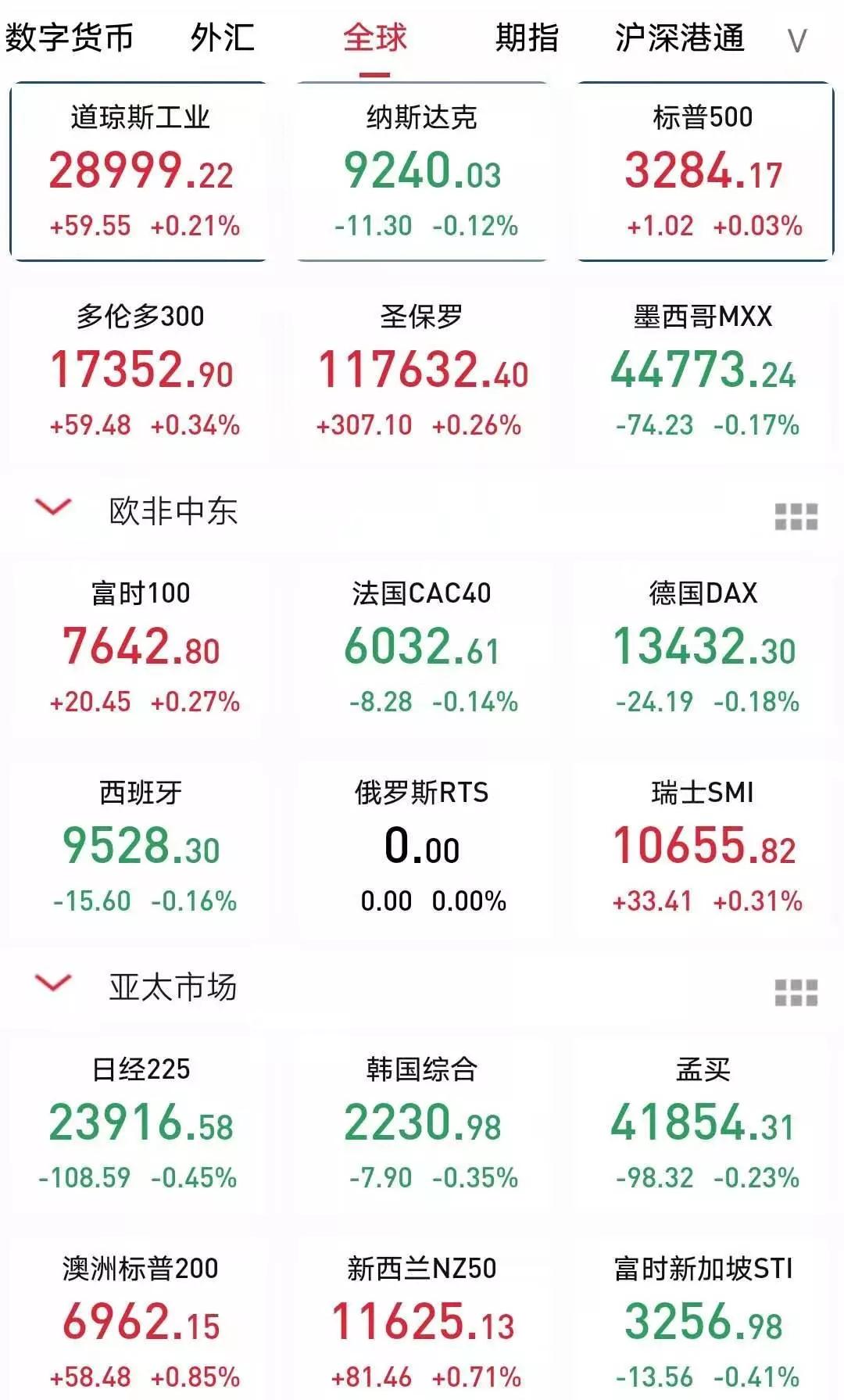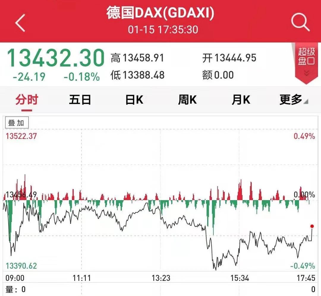 歐洲三大股指尾盤上揚:歐洲三大股指表現較為平穩,但臨近收盤,三大指數先后發起一波小幅上漲。截至收盤,英國富時指數上漲0.27%;法國CAC指數盤中略有下跌,隨后在尾盤開始回升,收盤跌0.14%;德國DAX指數跌0.18%。
