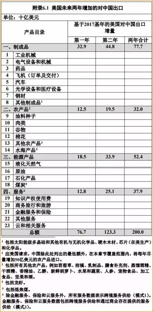 (四)在服務方面,如附錄6.1所示,在2017年基數之上,中國2020日歷年自美采購和進口規模不少于128億美元,2021日歷年自美采購和進口規模不少于251億美元。
