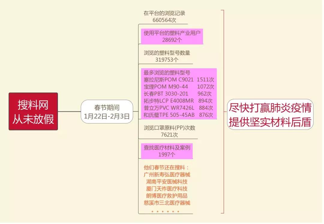 春節(jié)期間(1月22日~2月3日),搜料網(wǎng)發(fā)揮塑料產(chǎn)業(yè)互聯(lián)網(wǎng)平臺(tái)技術(shù)與資源優(yōu)勢(shì),信息共享,支援武漢。