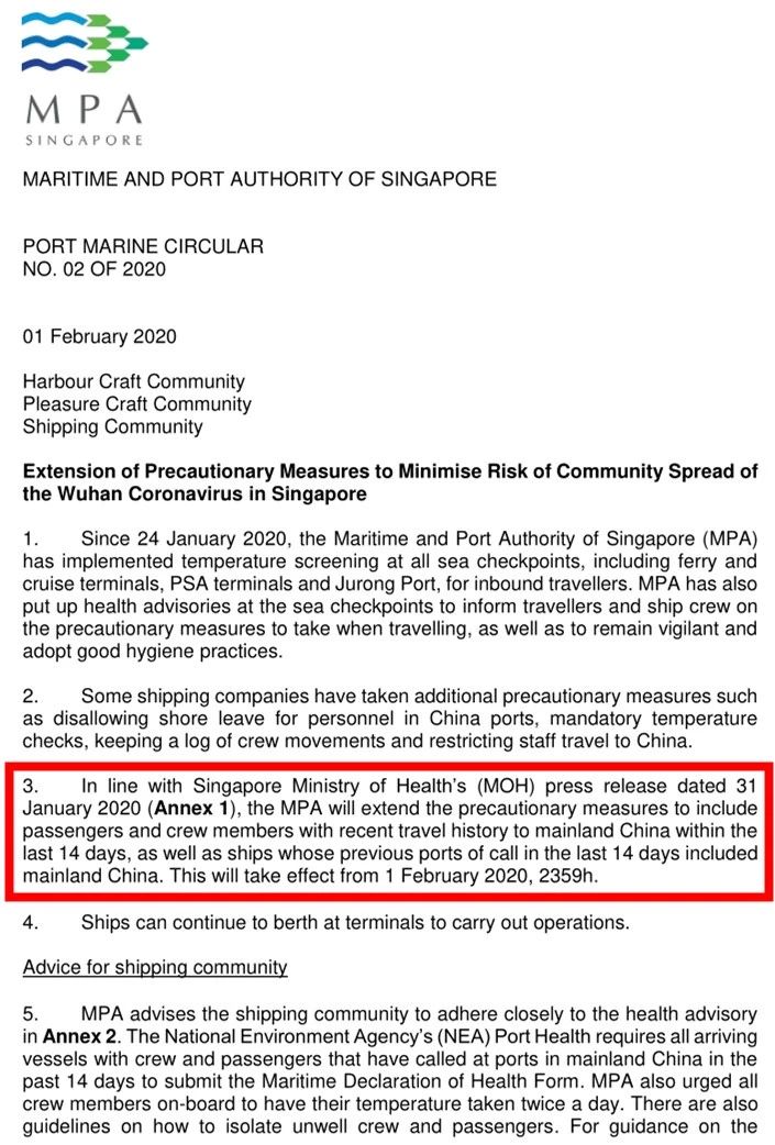 新加坡海事及港口管理局(MPA)2月1日發布通知稱,依照新加坡衛生部此前發布的相關規定,MPA將會對過去14天內前往中國大陸的旅客和船員,以及在過去14天內曾在中國大陸停靠過的船舶,實施更加嚴格的預防措施,增加檢疫流程,但不影響船舶靠泊作業。