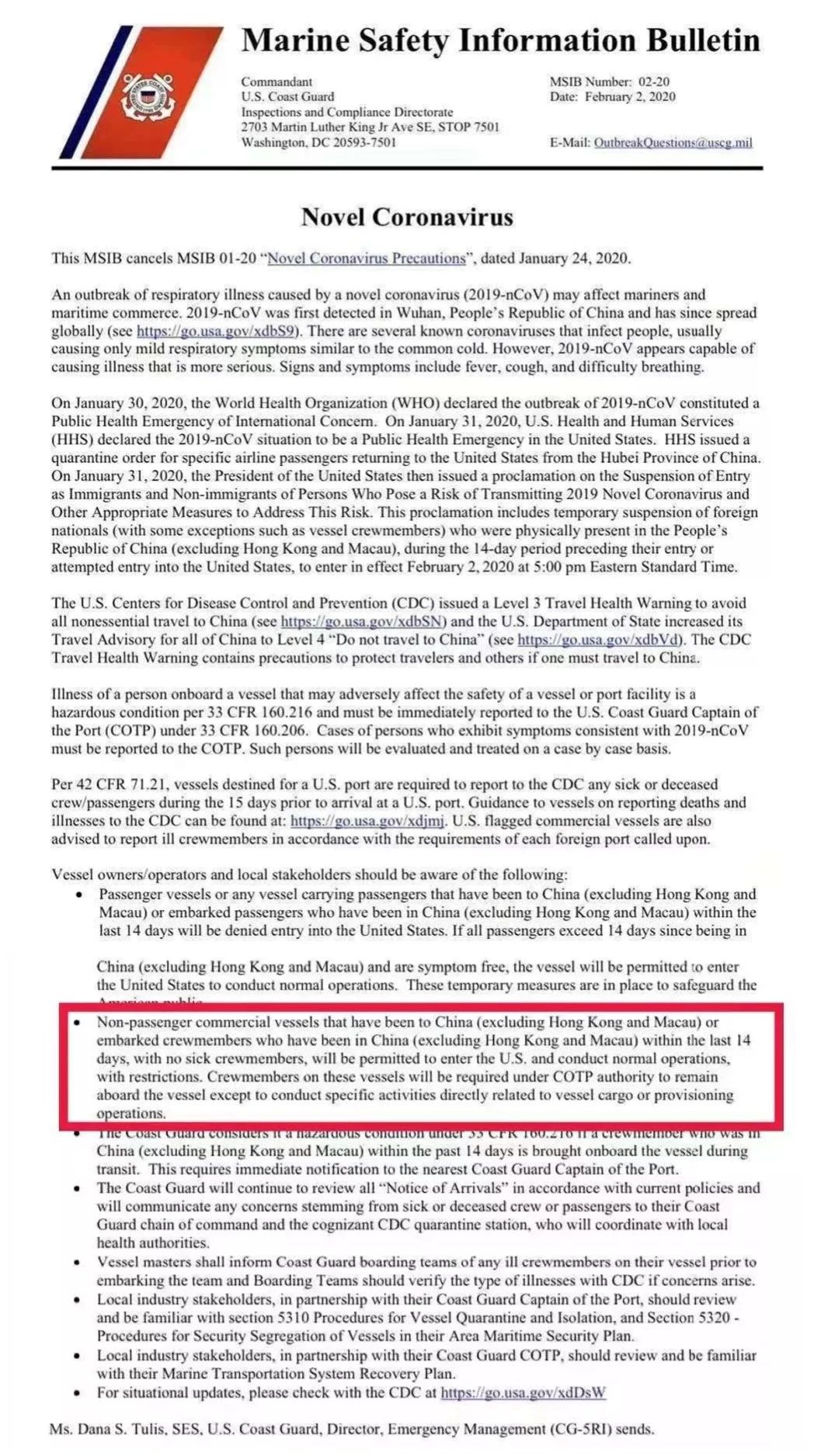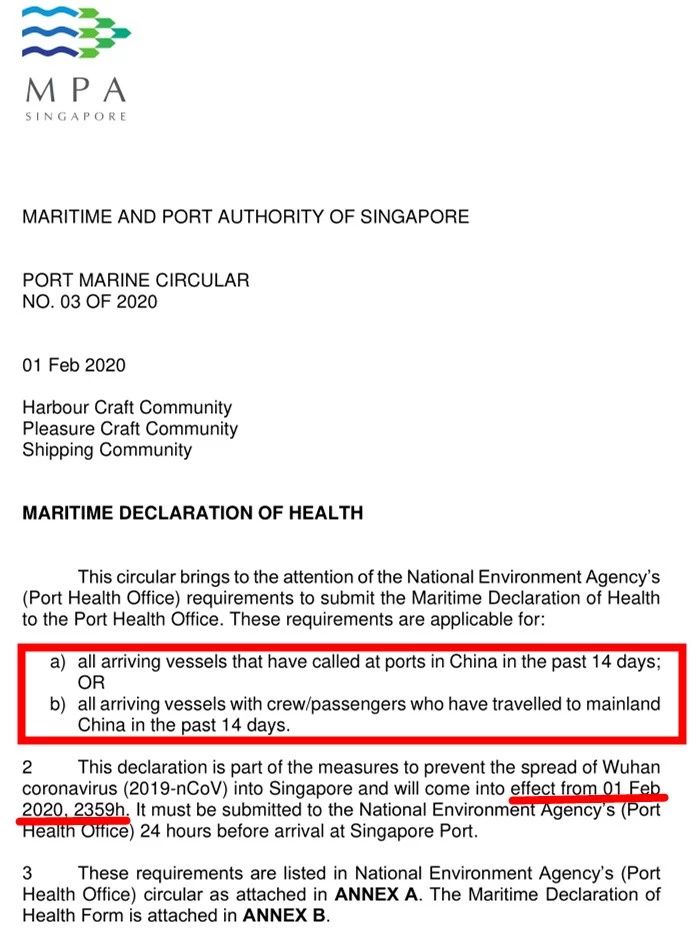 不過根據新加坡衛生部的要求,所有在過去14天內到訪過中國大陸的新訪客,將不被允許入境或過境新加坡。由于船員換班、下地需要入境,這也意味著船員將不被允許在新加坡換班和下地。