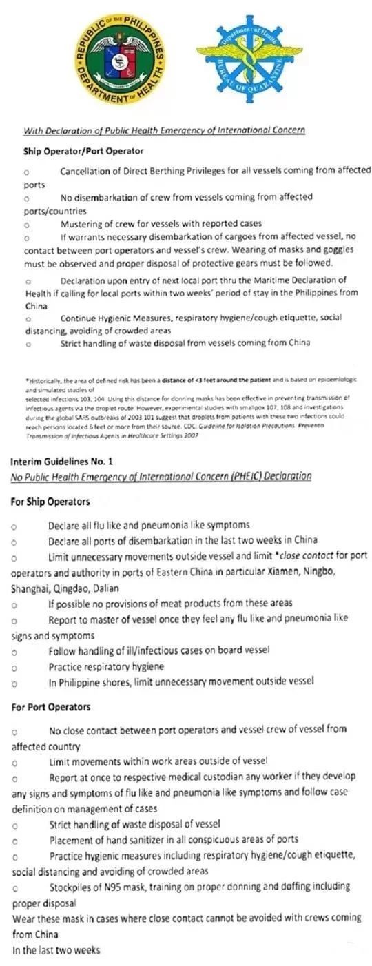 如果兩周內停靠過中國的船舶,將在菲律賓靠港的,船員應開具《海事健康證明》,在進入下一個當地港口時進行申報。