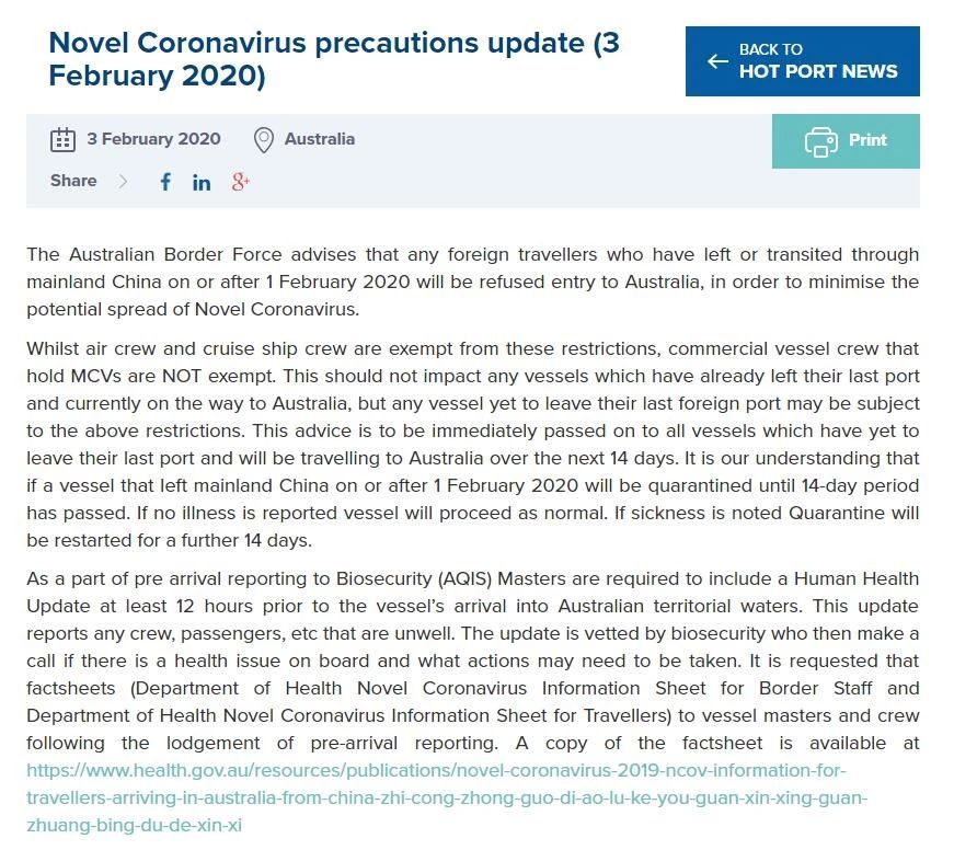 已有人閱讀此文 - -隨著新型冠狀病毒疫情的蔓延,對航運和貿易影響已有體現,各國和地區對口岸、港口以及船舶都采取了嚴格的防疫管控措施。貨代和外貿朋友注意了,特別是隨著各大港口對船舶管控加強,必將造成非經營性停泊時間過長,從而導致港口擁堵、貨物延遲!目前收集海外各國和地區對疫情防控措施如下: