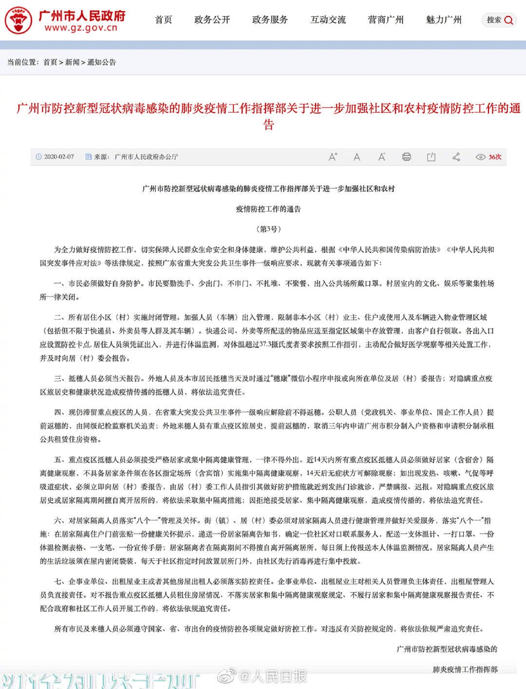 7日,廣州市人民政府辦公廳發布《廣州市防控新型冠狀病毒感染的肺炎疫情工作指揮部關于進一步加強社區和農村疫情防控工作的通告(第3號)》,要求所有居住小區(村)實施封閉管理、抵穗人員必須當天報告等。