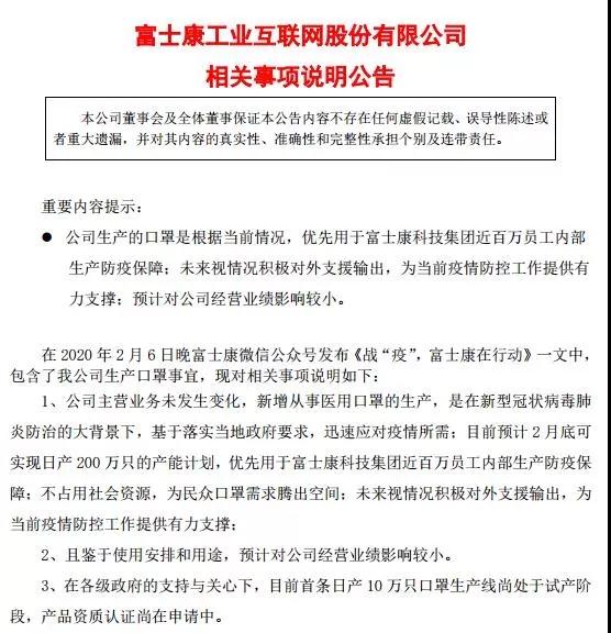 富士康目前預(yù)計(jì)2月底可實(shí)現(xiàn)日產(chǎn)200萬只的產(chǎn)能計(jì)劃,優(yōu)先用于富士康科技集團(tuán)近百萬員工內(nèi)部生產(chǎn)防疫保障:不占用社會資源,為民眾口單需求騰出空間:未來視情況積極對外支援輸出,為當(dāng)前疫情防控工作提供有力支撐。