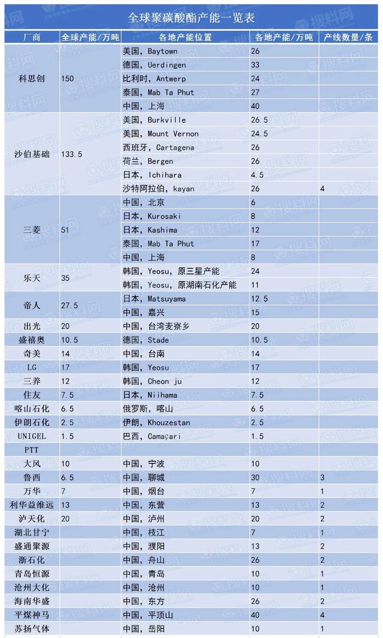 PC的全球生產商家主要有:沙特基礎工業公司、日本三菱、科思創、韓國三星、韓國三養、LG化學、臺化出光、臺灣奇美、嘉興帝人、俄羅斯喀山、寧波浙鐵大風化工等等。