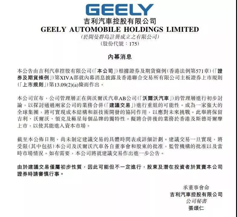 已有人閱讀此文 - -2月10日,吉利汽車發布內幕公告稱,公司管理層正在與沃爾沃汽車AB公司(沃爾沃汽車)的管理層進行初步討論,以探討通過兩家公司的業務合并進行重組的可能性。重組后的資產將納入吉利汽車香港上市公司,并將考慮未來在瑞典上市。