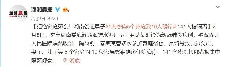 2月10日湖南省人民政府官網(wǎng)發(fā)布消息稱(chēng),2月8日,婁底市漣源海螺水泥廠(chǎng)員工秦某林確診為新冠肺炎病例,被雙峰縣人民醫(yī)院隔離收治。隔離前,秦某林曾多次參加家庭聚餐,最終導(dǎo)致身邊父母、妻子、兒子等5個(gè)家庭的10位家屬感染,確診住院治療,141名密切接觸者被集中隔離觀察。