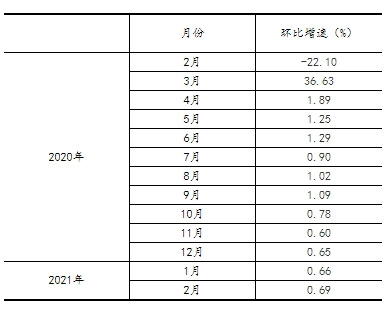 根據季節(jié)調整模型自動修正結果,對2020年2月至12月份規(guī)模以上工業(yè)增加值環(huán)比增速進行修訂。修訂結果及2021年1、2月份環(huán)比數據如下:
