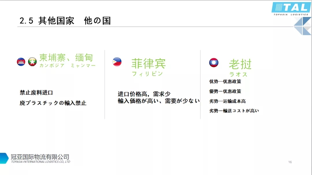菲律賓碼頭擁擠,國內安全環境堪憂,再生資源的利用規模非常小。進口成本比泰國還高約3500美金/柜,廢塑料企業很難生存。