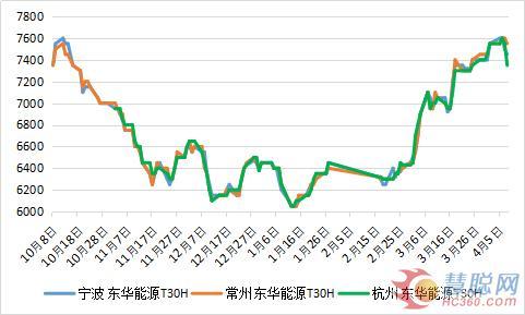 以華東地區牌號為東華能源T30H的產品為例,從圖中可以看出,上周初PP產品報價延續節前漲勢,隨后報盤下跌,周五下調明顯。其他地區產品也隨原油價格波動與東華能源T30H產品一樣,有類似調整。