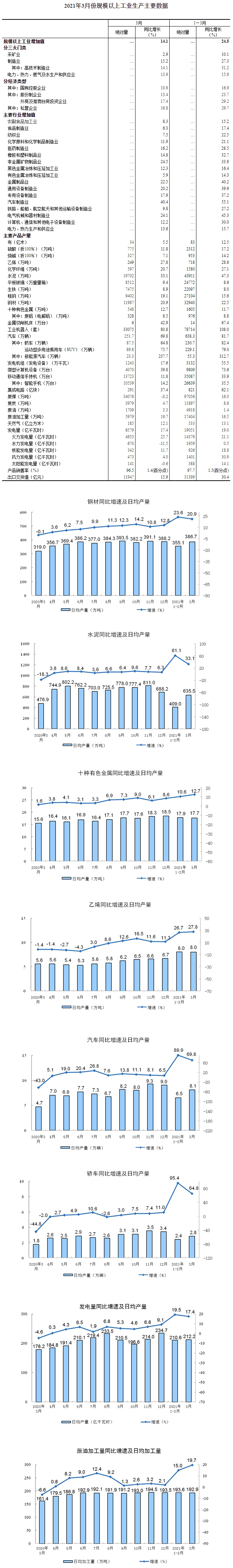 分產(chǎn)品看,3月份,612種產(chǎn)品中有505種產(chǎn)品同比增長(zhǎng)。鋼材11987萬(wàn)噸,同比增長(zhǎng)20.9%;水泥19702萬(wàn)噸,增長(zhǎng)33.1%;十種有色金屬548萬(wàn)噸,增長(zhǎng)12.7%;乙烯249萬(wàn)噸,增長(zhǎng)27.8%;汽車251.7萬(wàn)輛,增長(zhǎng)69.8%,其中,新能源汽車23.3萬(wàn)輛,增長(zhǎng)237.7%;發(fā)電量6579億千瓦時(shí),增長(zhǎng)17.4%;原油加工量5979萬(wàn)噸,增長(zhǎng)19.7%。