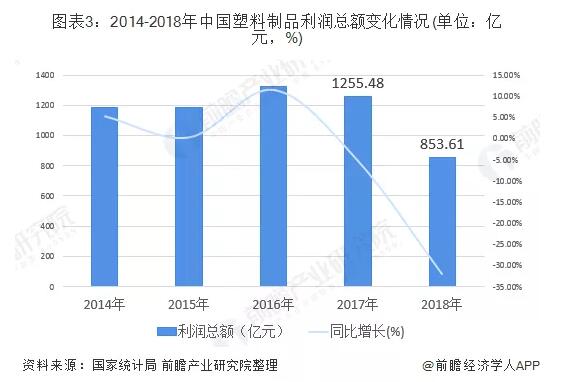 從行業利潤總額的情況來看,2014-2017年,中國塑料制品行業利潤總額呈波動上升的趨勢。2017年行業利潤總額達1255.48億元,2018年行業利潤總額驟跌至853.61億元,同比上年下降至32.01%。