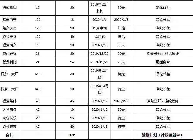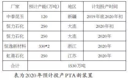 恒力石化一套250萬噸PTA裝置計劃2019年年底投放到市場,另外一套250萬噸PTA裝置計劃2020年投放到市場。