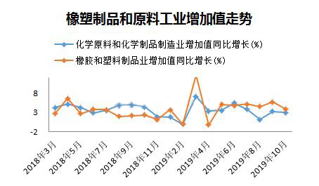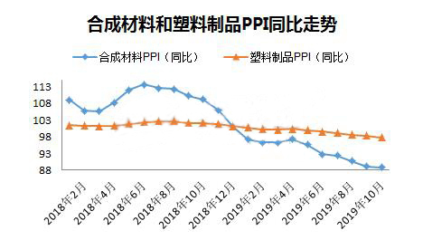 10月份,化學原料和化學品制造業增加值同比增長3%,橡膠和塑料制品業增加值同比增長3.9%,顯然下游制品業增速還是快于上游原料,兩者增速差連續三個月收窄,源于10月份制品業下降速度快于原料。去年10月份PE、PP等塑料原料價格揭開下滑序幕,橡塑制品的增速明顯低于原料,總體看隨著原料端價格下跌,終端產品成本降低,從塑料制品增長角度看制品行業目前形勢略好于去年。